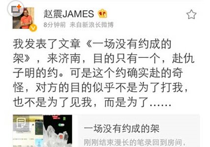 微博记录显示,两个媒体人约架源于此前在微博上的口水仗。7月22日,赵震在微博中写道,“行了,用脏话刷了各位一晚上屏,到现在为止,那个××小球再说什么哥不回了。他有诚意,中立地他挑,我奉陪,他一个人有本事打伤我,不用他出医药费。”赵震发给“辣笔小球”的私信记录显示,早在前天他就订好飞往济南的机票,而后者昨日上午也在微博中称,已订好高铁车票准备到济南———一个双方约定的“中立地”。按照“辣笔小球”的说法,他与赵震“无冤无仇”,只是因为“三番两次挑衅,那就不啰嗦了”。