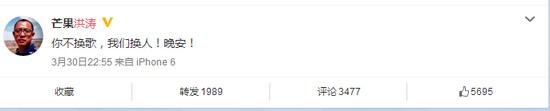 《我是歌手3》(在线观看)刚刚落下帷幕,孙楠(微博)退赛的风波还未平息,昨晚(3月30日),《我是歌手》(观看)总导演洪涛一条微博再次激起千层浪。在电视上一向和蔼可亲的洪涛在微博中以严厉口吻称“你不换歌,我们换人!”