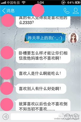 你一直说厌恶别人翻你手机,在之前微博上一次闹得很大的事情里发po说前女友翻前男友QQ简直卑鄙,你决定要去改QQ密码。看到这个的我只能说我在我们感情最好的时候,我也不记得你的QQ密码,你大可不必做出一副我是变态的样子,而你说没法儿忍受女朋友翻你手机,是因为基本上我仅有的几次翻你手机都能发现你出轨的痕迹么?比如你车祸后你让我帮你回短信时发现你撩了个14岁根本不知道你已经有了女朋友的女生,还看到你跟基友说:反正都是异地恋忙的过来。那时我没法儿质问病床上的你,只能一边照顾你一边在叔叔阿姨不在你也睡着的时候看着你哭,阿姨问我怎么了我只能装着没事儿。