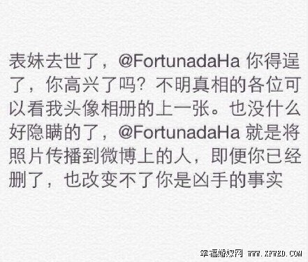 网络暴力造成了深航刘瑞琦跳楼事件,真的是太可拍了。随后#找出杀人犯FortunadaHa#已经上了微博话题榜,刘瑞琦表姐说就是微博名为“FortunadaHa”的发刘瑞琦不雅照片发到网上的,所以造成了刘瑞琦跳楼事件的发生。