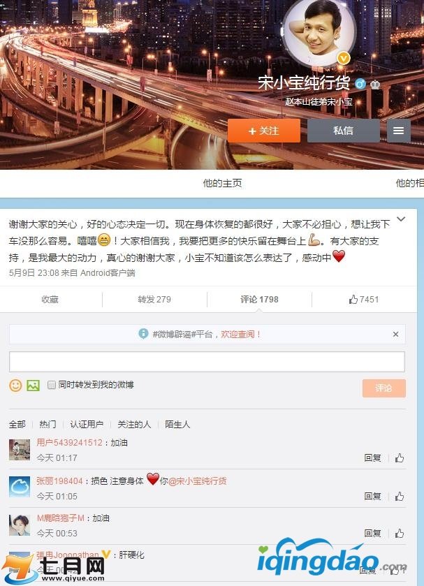 对于网友的关心,宋小宝发文致谢:“谢谢大家的关心,好的心态决定一切。现在身体恢复的都很好,大家不必担心,想让我下车没那么容易。嘻嘻!大家相信我,我要把更多的快乐留在舞台上。有大家的支持,是我最大的动力,真心的谢谢大家,小宝不知道该怎么表达了,感动中。”而在评论中,有微博名为“張冉Jooonathan”的认证用户爆料称,宋小宝不幸患上的疾病是肝硬化。