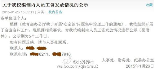 芒果台主持人何炅被举报在北京外国语大学(以下简称“北外”)“吃空饷”。举报人北外教职工乔木微博上称,何炅编制在北外,但已经“好多年没来上过班”,却依然领取工资。乔木在举报材料中贴了一张公告截图,名为《北京外国语大学工资在发编制内人员名单》。名单是2015年1月26日,北外根据教育部办公厅要求开展吃空饷问题集中治理工作后公布的。何炅位列名单869号,类别为“在职”。“经向所在院系老师证实,此何炅就是娱乐明星、主持人何炅。”乔木称,何炅编制虽在学校,但好多年没来上过班,“相关的工作、邮件、联系等,都不得不由其他老师处理。”乔木认为,如果何炅编制在北外并领取工资,就应当上班。“既然全职全时活跃在娱乐界,不能履职,为何还要保留高校的编制?”