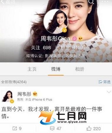 6月12日晚10时30分左右,周韦彤发了一条“直到今天,我才发现,离开是最难的一件事”的微博,随即秒删。当即就有网友手快截图,并引来其他网友们的围观与猜测,甚至有某八卦博主表示:“今天都在议论周韦彤昨晚发离开微博,随即秒删!还好有手快的截图党,不管是看热闹不嫌事大的还是天真的不知道发生什么的,都赶紧来围观吧,目测会爆!”。