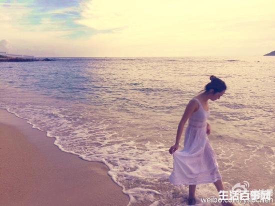 姚晨举家海边玩耍 穿白裙动人老公啤酒肚