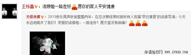 导读:今天(9月29日),“2013快乐男声”官方微博发博透露,《快乐男声》导演李洁婷因病去世。两年前的9月27日,华晨宇 在夺冠后曾为其送上祝福,“洁婷加油,早日康复!”今天,快男白举纲、宁桓宇 也陆续发博悼念,“洁婷姐,一路走好!”