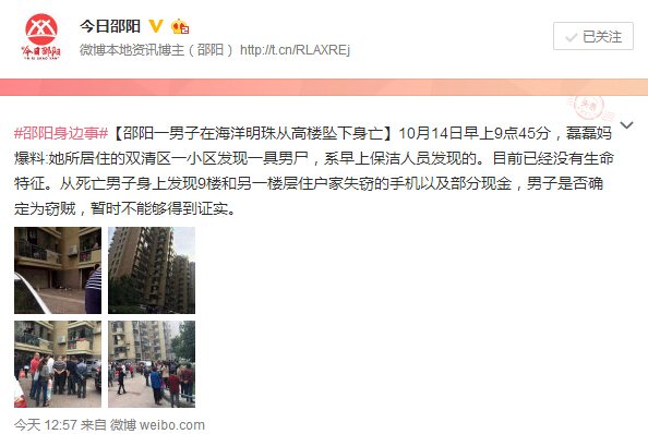 内容摘要:#邵阳身边事#【邵阳一男子在海洋明珠从高楼坠下身亡】10月14日早上9点45分,磊磊妈爆料:她所居住的双清区一小区发现一具男尸,系早上保洁人员发现的。目前已经没有生命特征。从死亡男子身上发现9楼和另一楼层住户家失窃的手机以及部分现金,男子是否确定为窃贼,暂时不能够得到证实。