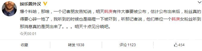 爆个料哈,那啥,一个记者朋友告知说,明天韩庚有件大事要被公布,估计公布出来后,粉丝真的得要心碎一地了,我听到的时候也是咯噔一下被吓到,听那记者说,他们单位一个韩庚女粉丝听到那消息真的是哭出来了。。。明天十点见分晓吧。