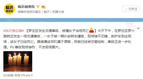 内容摘要:#临沂身边事# 【罗庄区发生交通事故,被撞女子当场死亡[蜡烛]】今天下午,在罗庄区罗六路附近发生一场交通事故,一女子被一辆长安轿车撞倒,现场惨不忍睹,救护车到达现场,该女子已经死亡。据透漏该司机属于酒驾,目前已经被交警控制,事故正进一步处理。Ps:事故现场惨烈,不发现场图片。