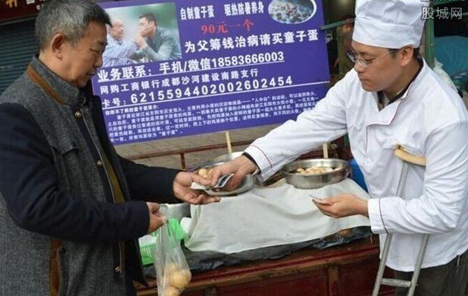 近日,在遂宁市北固乡街头,有一名拄着拐杖的残疾小伙王建波吃力地推着三轮车以90元一枚的价格叫卖自家秘制的“童子蛋”。一枚童子尿蛋竟卖出90元的天价,因为它物超所值,且制作过程非常复杂,它还相当于一味补药。