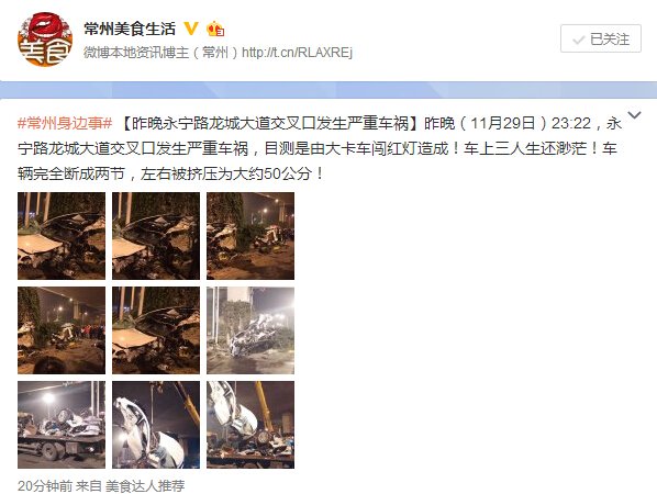 昨晚(11月29日)23:22,永宁路龙城大道交叉口发生严重车祸,目测是由大卡车闯红灯造成!车上三人生还渺茫!车辆完全断成两节,左右被挤压为大约50公分!