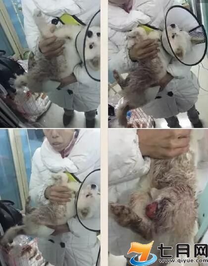 12月13日晚7点,受虐小狗由爱心人士带到建设街德惠路的金娃娃宠物医院,赵医生马上进行手术救治。