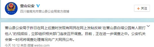 营山县公安局于昨日在网上巡查时发现有网民在网上发帖反映“在营山县白塔公园有人殴打他人”的视频后,立即组织相关部门连夜召开调查。目前,正在进一步调查之中。公安机关会第一时间将调查处理情况向广大网民公布。