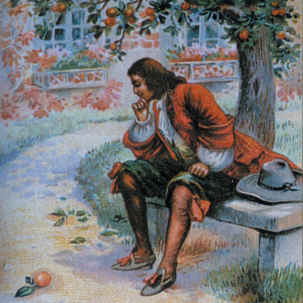 牛顿:1666年,23岁的牛顿还是剑桥大学圣三一学院三年级的学生,一天傍晚,他坐在苹果树下乘凉,一个苹果从树上掉了下来,受此启发,他发现了万有引力。