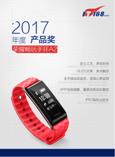 荣耀畅玩手环A2配置了0.96英寸的多点触控显示屏,支持来电提醒、信息内容查看、连续心率监测、睡眠监测等功能。同时记录里程、卡路里、步数、时间等数据,拥有跑步、走路、骑行模式,单次运动数据实时显示及保存,脱离 手机 也可以单独使用。1.5小时快捷磁吸充电,续航能力长达9天。IP67级防尘防水,日常使用不用担心。近期,荣耀畅玩手环A2也凭借着这些出色的亮点被IT168评选为『2017年度产品奖』。