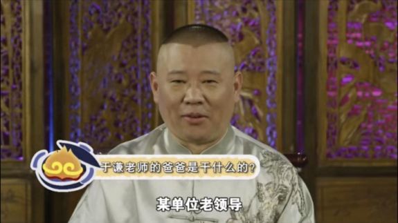 最后一个问题就很有意思了,问他:“于谦老师的爸爸是干什么的?”,看来郭德纲“黑”于谦爸爸的段子已经给网友留下了极为深刻的印象,让“于谦他爹”成为了一个神一般的人物,这才促使网友们向老郭提问求证。郭德纲这一回到没有开玩笑,正经的说了句:“某单位老领导”。这下网友们可不会误会于谦老师的爸爸了吧。