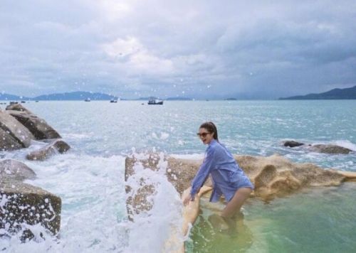 何穗海边照片秀翘臀美腿 下衣失踪泳装包裹性感好身材