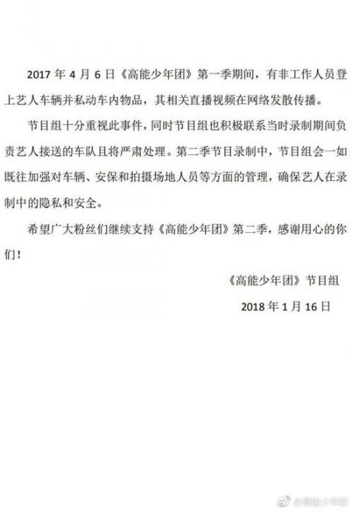 1月16日,高能少年团官博称:“2017年4月6日《高能少年团》第一季期间,有非工作人员登上艺人车辆并私动车内物品,其相关直播视频在网络发散传播。节目组十分重视此事件,同时节目组也积极联系当时录制期间负责艺人接送的车队且将严肃处理。第二季节目录制中,节目组会一如既往加强对车辆、安保和拍摄场地人员等方面的管理,确保艺人在录制中的隐私和安全。希望广大粉丝们继续支持《高能少年团》第二季,感谢用心的你们!”