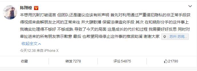 本想用沉默打破谣言 但团队还是建议应该有所声明 首先对利用通过严重侵犯隐私的非正常手段获得视频来曲解朋友之间的正常来往 并大肆散播 保留法律追究手段 其次 在和晓彤分手的这件事上我确实处理得不够好 不够成熟 导致了今天的局面 这是成长的代价和过程 我需要好好反思 同时对牵扯进来的所有朋友表示歉意 最后 也希望网络停止这件事的推波助澜 谢谢大家